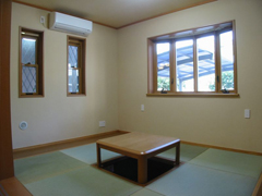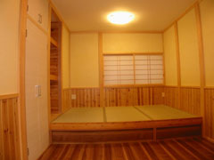 畳を1段高くしています。杉板を張った腰壁の上は、健康素材の珪藻土仕上です。