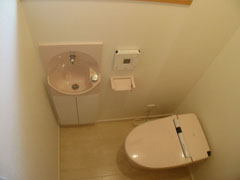 スペースに余裕がありませんが、タンクレストイレと壁埋め込み式手洗いの採用で快適なトイレになりました。
